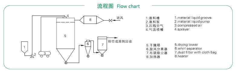 The clean air is heated and entered into the drying tower, the raw material inside the tower is atomizied and becomes mini liquid drops through second-rate or third rate nozzle. The raw materials carry out heat exchange with the hot air rapidly to evaporate the moisture (solvent ) in the raw materials. The moisture or solvent is discharged accompany with hot air, then the powder product is got.