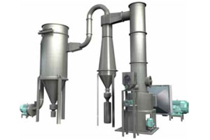 The hot air enters into the bottom of the drier in tangent direction. Under the driving of the stirrer, a powerful rotating wind field is formed.The paste state materials enter into the drier through the screw charger. Under the powerful function of the stirring vanes at high-speed rotation, the materials are distributed under the function of strike, friction and shearing force. The block state mate-rials will soon be smashed and contact the hot air fully and the materials are heated and dried. The dried materials after the dewatering will g o up with the heatair flow. The step rings will stop and keep the big particles. Small particles will be discharged out of the drier from the ring center and will be restored by the whirl separator and dust remover. The not-fully-dried or big piece materials will be sent to the wall of the equipment by centrifugal force function and be smashed again after they fall down to the bottom.