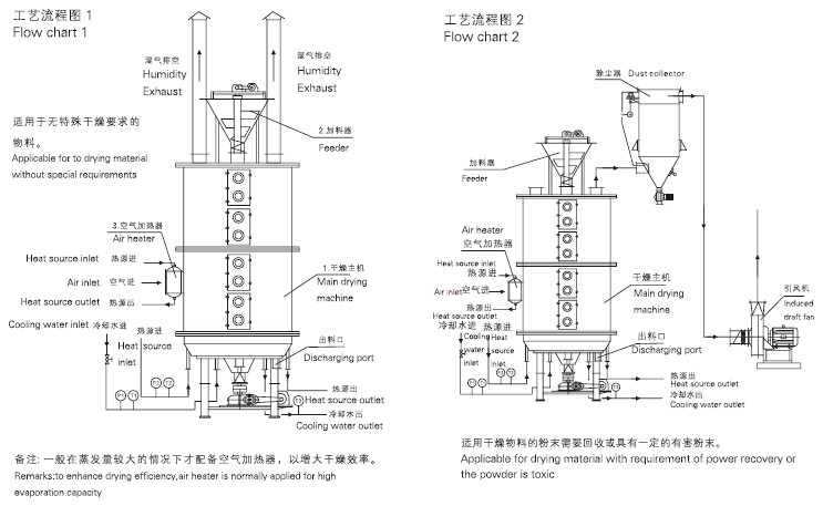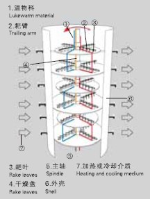 Wet materials are fed continuously to the first drying layer on the top of the dryer. They will be turned and stirred by harrow arms when the arm rotates and drop down to the outer edge of the large drying plate along the exponential helical line. On the small drying plate they will be moved to its outer edge and drop down to the outer edge of the large drying plate underneath, and will be moved inward and drop down from its central hole to the small drying plate on the next layer. Both small and large drying plates are arranged alternately so as materials can go through the whole dryer continuously. The heating media, Which could be informs of saturated steam, hot water or heat conducting oil will be led into hollow drying plates from one end to the other end of the dryer. The dried materials will drop from the last layer of the drying plate to the bottom layer of the shell body, and will be moved by rakes to the dischargeport. The moisture escapes from materials and will be removed from the moist discharge port on the top cover, or sucked out by the vacuum pump on the top cover for vacuum-type plate dryer. The dried materials discharged from the bottom layer can be packed directly. The drying capability can be raised up if equipped with supplementary devices such as finned heater, condenser for solvent retrieval, bag dust remover, return and mix mechanism for dried materials and drawing fan etc. Solvent in those dried paste and heat sensitive materials can be easily retrieved, and thermal decomposition and reaction can be also carried out.